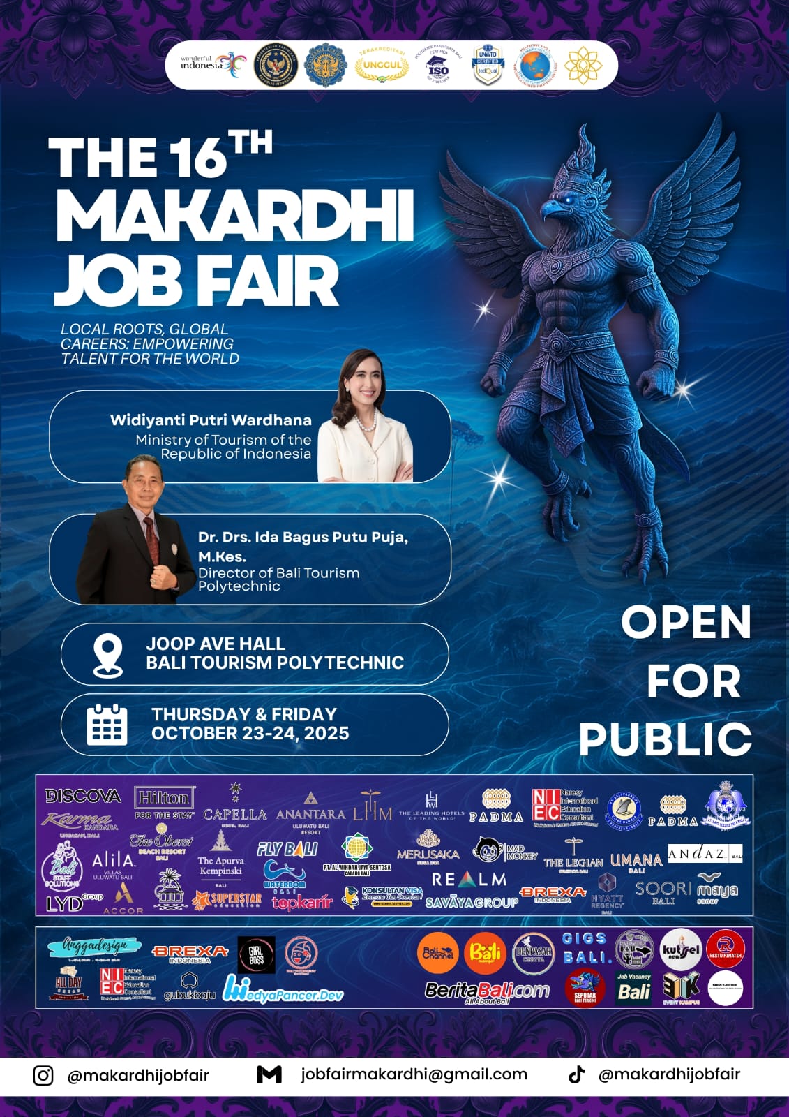 Politeknik Pariwisata Bali mengadakan The 16th Makardhi Job Fair, ajang tahunan yang menghadirkan berbagai peluang karier di industri pariw1...